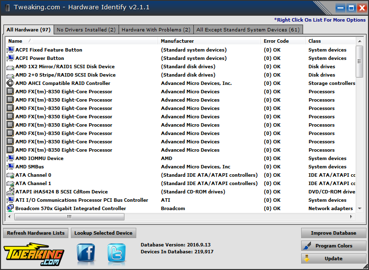 Hardware Identify de Tweaking.com, est un programme à télécharger et utiliser gratuitement. Il vous aidera à identifier le matériel inconnu sur votre système. c'est un logiciel léger, en raison de sa taille (7,45 MB) et de l'interface utilisateur minimaliste. De ce fait, l'utilisation doit être simple à comprendre pour le plus novice des utilisateurs. cet utilitaire existe aussi en version portable.